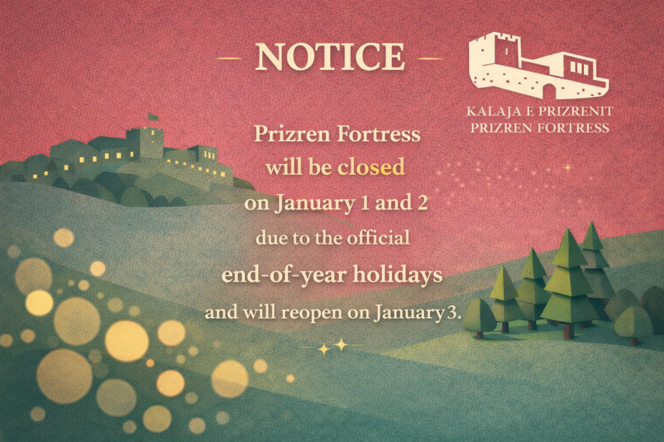 📢 Notice – Prizren Fortress Holiday Closure Due to the official end-of-year holidays, Prizren Fortress will be closed on January 1 and 2, 2026. We will be happy to welcome visitors again as we reopenPublic Holiday – Closed
